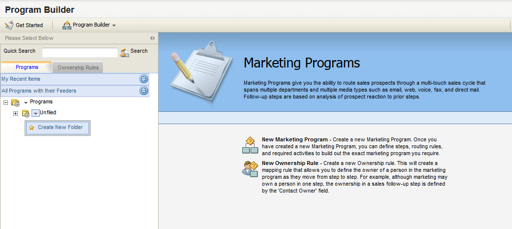 Note: The program builder is an application separate from the Program Canvas. Program Canvas is an easy to use, drag-and-drop whiteboard that allows you to transform data within Oracle Eloqua in real-time.