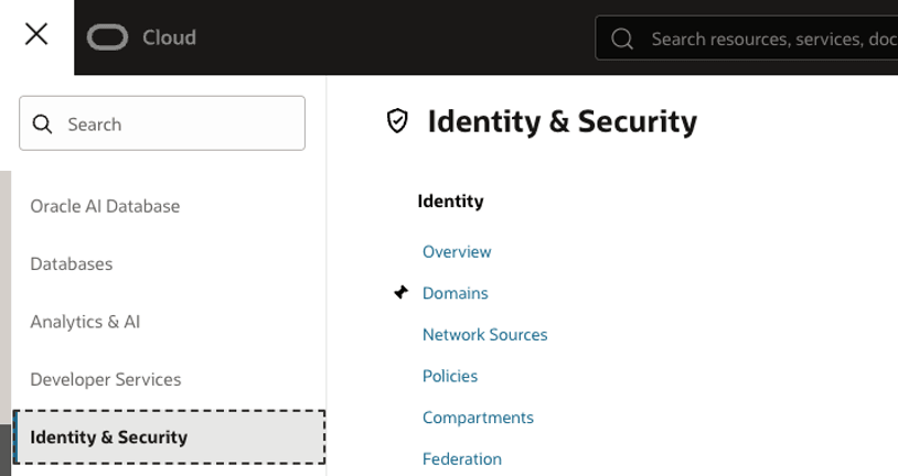 - Expand the hamburger menu in the top left corner, then scroll down to Identity & Security menu, click it to expose all options on the right pane. In the Identity section, click Domains. The Domain List page opens.