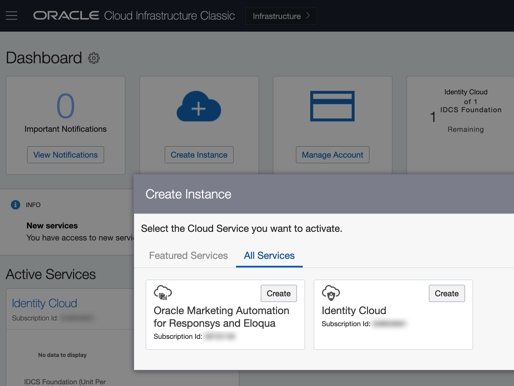 - On the Create Instance dialog, locate Oracle Marketing Automation for Responsys and Eloqua and then click Create.