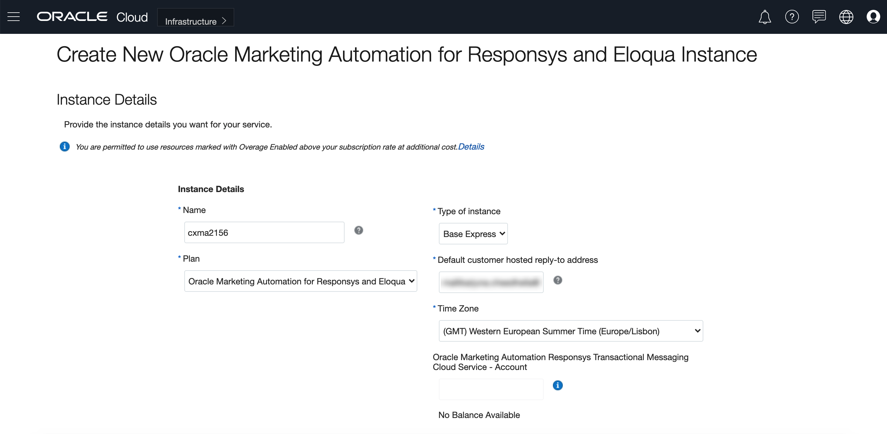 - On the Create New Oracle Marketing Automation for Responsys and Eloqua Instance page, complete the instance details: