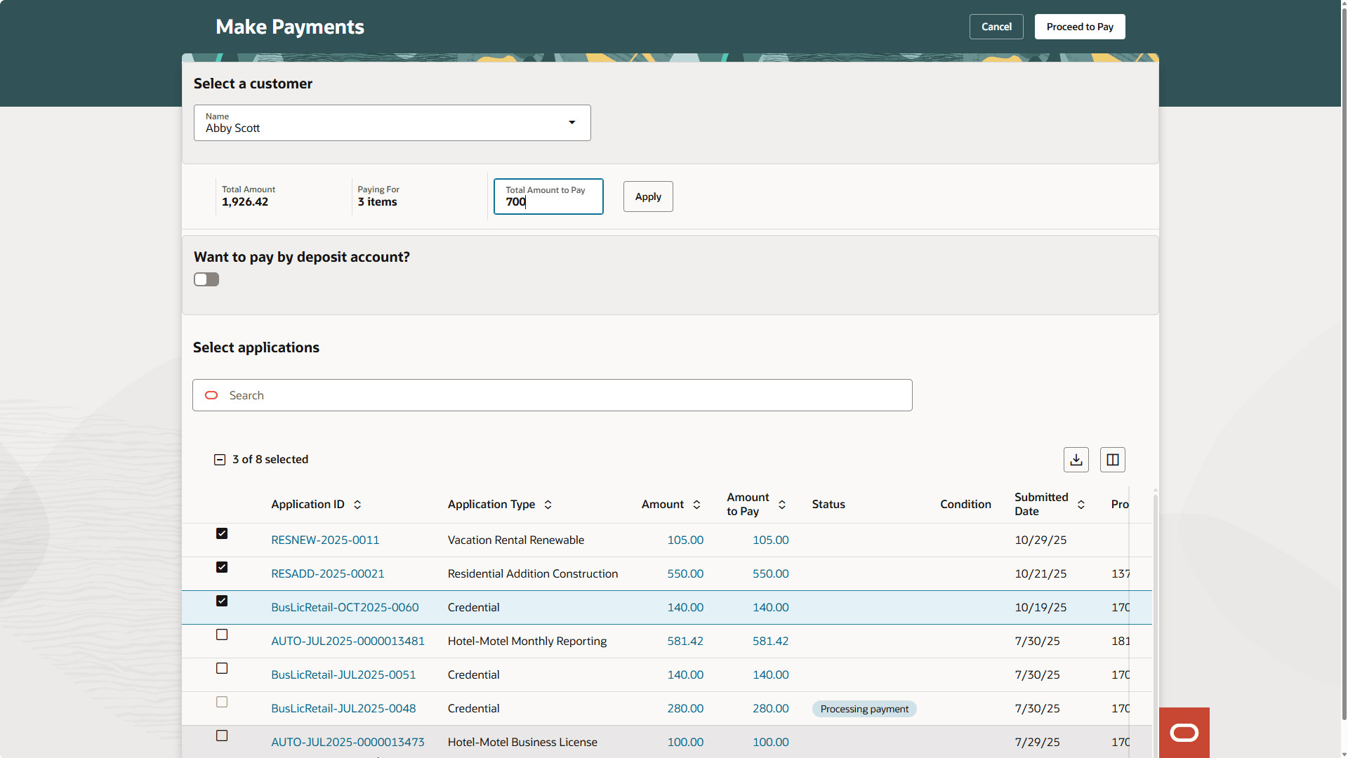 Note:When the integration with Oracle Receivables is enabled, both invoiceable and non-invoiceable applications are displayed in the list. You can't select invoiceable and non-invoiceable applications to be paid together in a single payment. Payments for each group must be selected and processed separately.