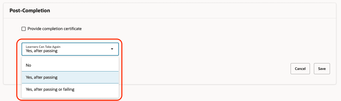 Yes, after passing or failing (default): Learners can retake after they complete it, regardless of whether they passed or failed.