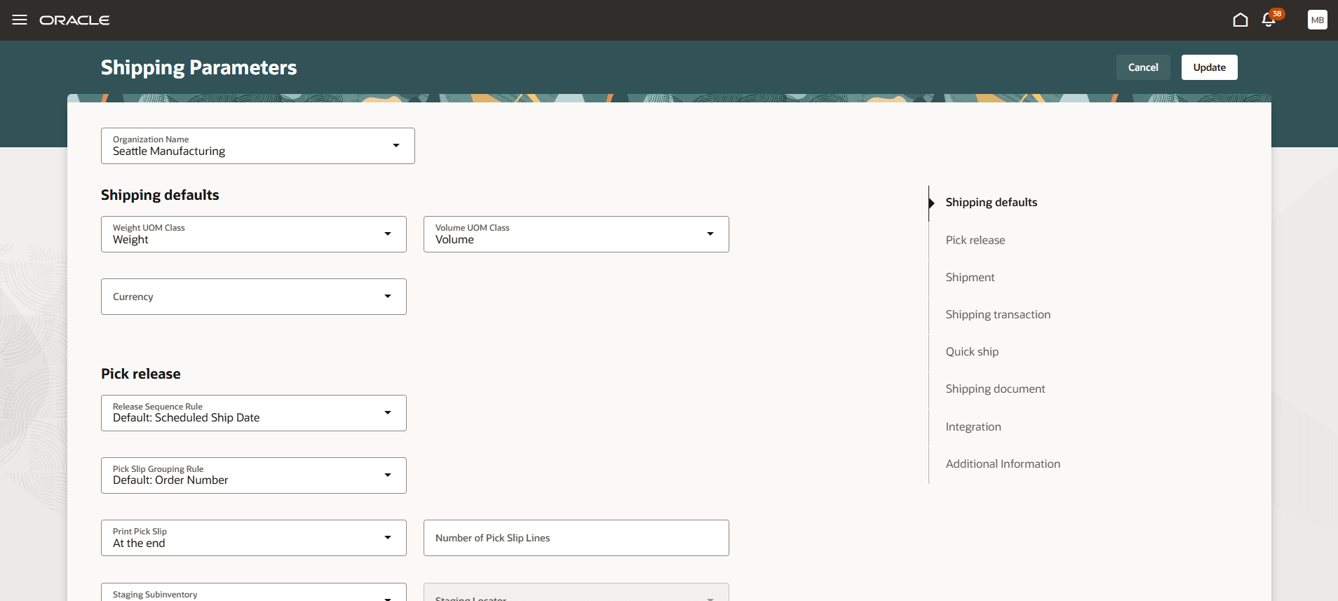 In the Setup and Maintenance work area, the Redwood version of the Shipping Parameters page is enabled by default in this update, but the existing version of the Manage Shipping Parameters page is still available in the Manufacturing and Supply Chain Materials Management offering. You should move to the Redwood version of the page at your earliest convenience, because the existing version of the page will be removed from the application in a future update.