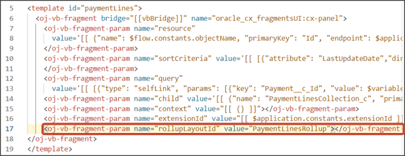 <template id="paymentLines"> <oj-vb-fragment bridge="[[vbBridge]]" name="oracle_cx_fragmentsUI:cx-panel"> <oj-vb-fragment-param name="resource" value='[[ {"name": $flow.constants.objectName, "primaryKey": "Id", "endpoint": $application.constants.serviceConnection } ]]'> </oj-vb-fragment-param> <oj-vb-fragment-param name="sortCriteria" value='[[ [{"attribute": "LastUpdateDate","direction": "desc" }] ]]'> </oj-vb-fragment-param> <oj-vb-fragment-param name="query" value='[[ [{"type": "selfLink", "params": [{"key": "Payment__c_Id", "value": $variables.id }]}] ]]'></oj-vb-fragment-param> <oj-vb-fragment-param name="child" value='[[ {"name": "PaymentLinesCollection_c", "primaryKey": "Id", "relationship": "Child"} ]]'></oj-vb-fragment-param> <oj-vb-fragment-param name="context" value="[[ {} ]]"></oj-vb-fragment-param> <oj-vb-fragment-param name="extensionId" value="{{ $application.constants.extensionId }}"></oj-vb-fragment-param> <oj-vb-fragment-param name="rollupLayoutId" value="PaymentLinesRollup"></oj-vb-fragment-param> </oj-vb-fragment> </template>