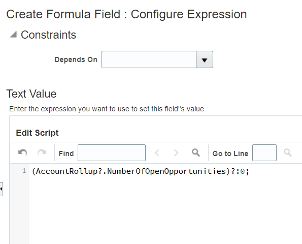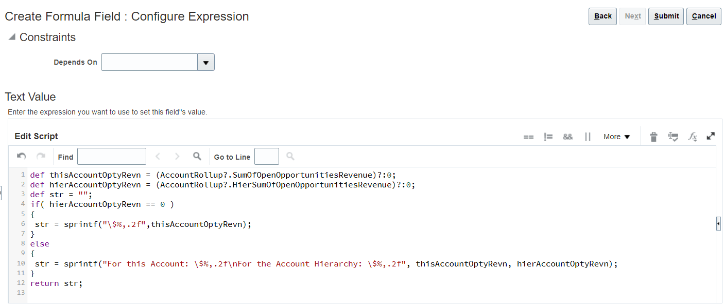 def thisAccountOptyRevn = (AccountRollup?.SumOfOpenOpportunitiesRevenue)?:0; def hierAccountOptyRevn = (AccountRollup?.HierSumOfOpenOpportunitiesRevenue)?:0; def str = ""; if( hierAccountOptyRevn == 0 ) { str = sprintf("\$%,.2f",thisAccountOptyRevn); } else { str = sprintf("For this Account: \$%,.2f\nFor the Account Hierarchy: \$%,.2f", thisAccountOptyRevn, hierAccountOptyRevn); } return str;Here's a sample image of the Create Formula Field: Configure Expression page:
