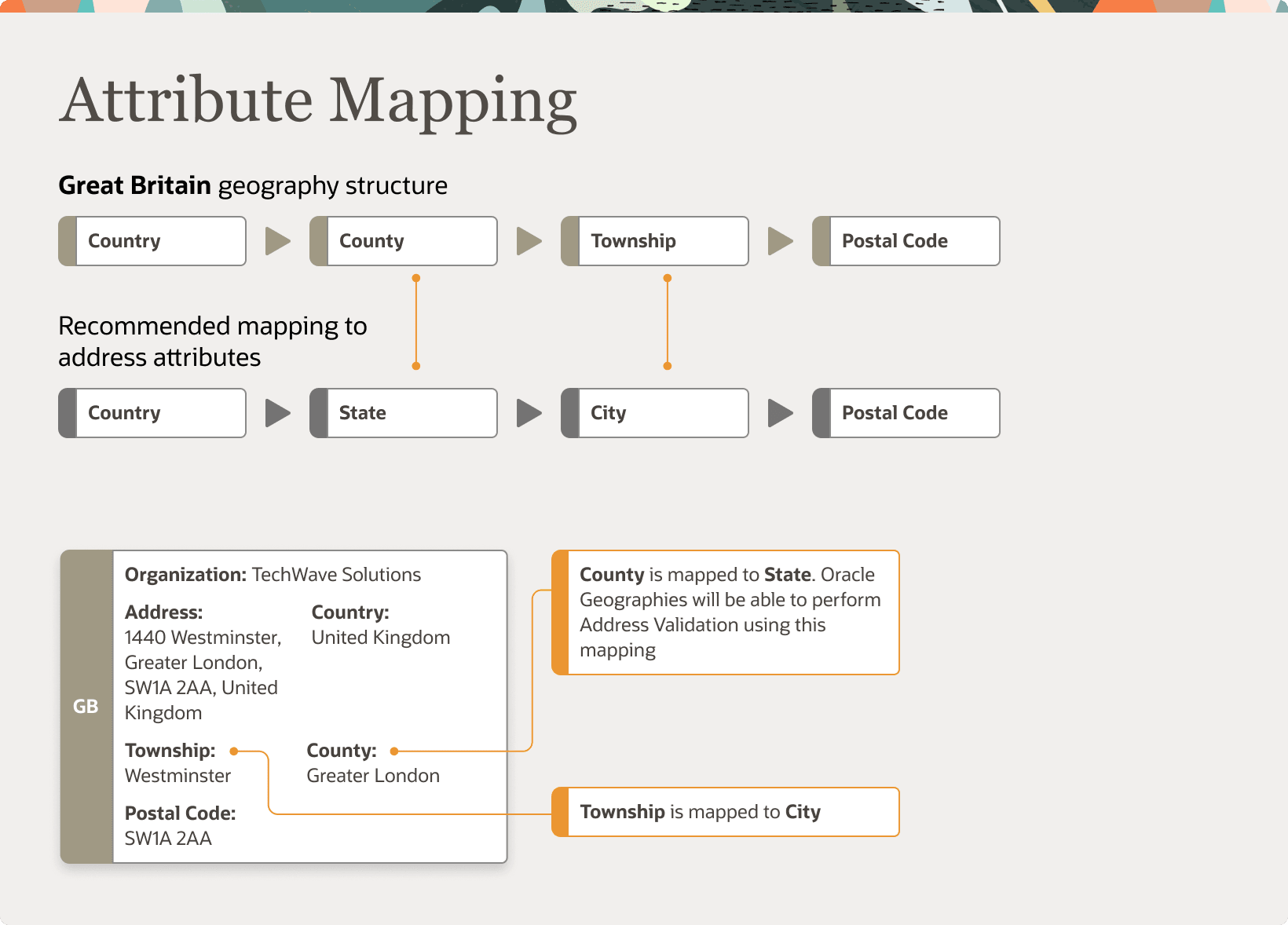 For every address style format, you can map each geography type to an address attribute. For example, you can map the State geography type to the State address attribute for the United States, or map the State geography type to the County address attribute for the United Kingdom. The geography types that appear are based on how the country structure is defined. The list of address attributes that appear are based on address formats delivered with the application, or your customer defined address formats.