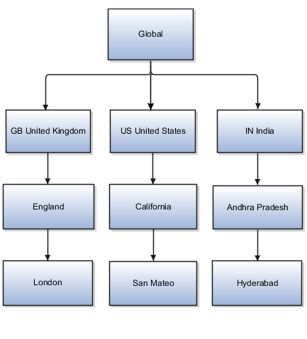 You can create versions of the predefined geography tree structure to represent countries in which your enterprise operates. For each country, you can define lower-level nodes such as states and cities. For example, United Kingdom - England - London. You manage trees in the Workforce Structures work area.