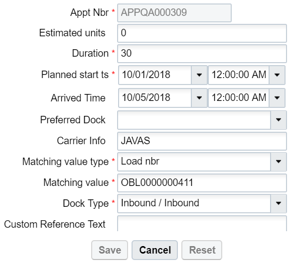 - Check in – Check in Appointment. Updates the dock location on the Trailer when the matching value type of the appointment is Trailer nbr, and the matching value is a trailer nbr that exist in the Trailer UI.