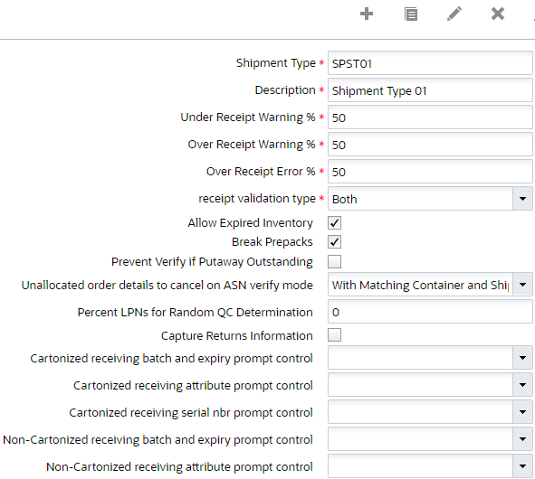 ASN Field Description Shipment Type The unique ASN/Shipment type code. Description Description of the ASN type. Under Receipt Warning % Field used to determine when the system should throw a warning message when an ASN item is under-received below the configured percentage. This warning message is displayed during ASN verification. Over Receipt Warning % Used to display a warning message when the user over-receives the ASN detail by above the defined % value. The user may choose to override this message. Over Receipt Error % Used to display an error message when the user over-receives the ASN detail by the defined %. The user cannot override this message. Receipt Validation Type If this field is selected, users can configure at what level the validation (from three previous fields) is required, whether at the PO, ASN or both. Allow expired inventory If set to yes, the system will prevent expired inventory from getting allocated, picked, substituted or shipped. Break Prepacks If the shipment's IB Shipment Type has the 'Break Prepacks Flag' set to True, the system will break all shipment details that have parent items into their corresponding children based on the definition in the 'Item Prepack' table. Prevent Verify if Putaway Outstanding If the 'Prevent Verify if Putaway Outstanding' flag is set to TRUE, the application will prevent verifying the corresponding shipment before all the received LPNs have been putaway. Unallocated order details to cancel on ASN verify mode Controls the behavior of cancelling an order line associated with a required LPN number when the corresponding LPN is part of the shipment but not received. Percent LPNs for Random QC Determination Used to determine which Inbound LPNs are marked for QC. If the shipment type is not present in the system or Percent LPNs for Random QC Determination is zero, then the Vendor QC Rule configuration will determine which Inbound LPNs should be marked for QC (upon selecting the action button "Perform Inbound QC Check".) Capture Returns Information If the shipment type has "capture_return_info_flg" set to Yes and Returned from Information is not captured, the system will not allow you to create an ASN. The system will throw error message "Shipment type is configured to capture returns information" after you click save. Cartonized receiving batch and expiry prompt control Blank/ Prompt, if not known/Always prompt/ Do not prompt. Allows you to configure the batch and expiry prompts at the individual shipment level for cartonized ASNs. Cartonized receiving attribute prompt control Blank/Prompt, if not known/Always prompt/ Do not prompt. Allows you to configure the receiving attribute prompts at the individual shipment level for cartonized ASNs. Cartonized receiving serial number prompt control Blank/Prompt, if not known/Always prompt/ Do not prompt. Allows you to configure the receiving serial number prompts at the individual shipment level for cartonized ASNs. Non-cartonized receiving batch and expiry prompt control Blank (Default behavior)/ Prompt, if not known/Always prompt. Allows you to choose whether to prompt for multiple batch/expiry/Attribute/serial for a single SKU in a non-cartonized ASN. Non-cartonized receiving attribute prompt control Blank (Default behavior)/ Prompt, if not known/Always prompt. Allows you to choose whether to prompt for multiple batch/expiry/Attribute/serial for a single SKU in a non-cartonized ASN.