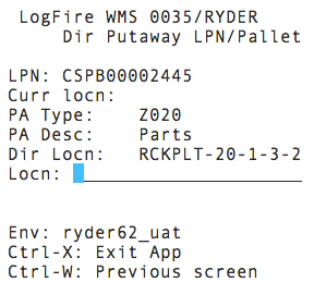 - Go to the location prompted; scan the location barcode, and putaway the LPN.