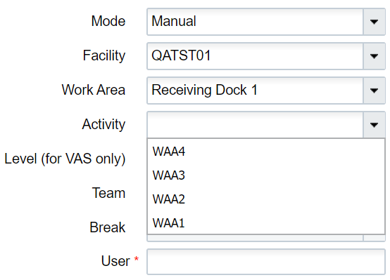 When a user or a group of users (team) need to be clocked into or out of a certain VAS activity, set Mode as “VAS”. Select the appropriate facility from the Facility drop down, followed by the Work Area from the Work Area drop down. From the Activity drop down, Select the activity that the user or team need to work on. Select “user” or “team” (as required) from the Level drop down. Depending on the Level selection, enter either the login ID of the user in the User field OR select a team from the Team drop down. Next hit the clock-in or clock-out button as required.