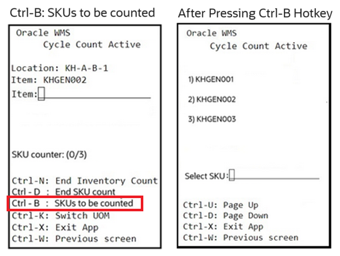 - In SKU-Quantity mode, you are required to press CTRL-D hotkey to end the SKU being counted and to proceed for the next SKU prompt. Once all SKUs are counted from the list, pressing CTRL-D hotkey ends the cycle count task automatically. When screen parameter “qty-uom” is set to “infer UOM from item barcode”, the system displays both CTRL-N and CTRL-D hotkeys. The CTRL-N hotkeyallows you to end the inventory count of the SKU being prompted (SKU with the selected attribute combination) whereas CTRL-D ends the count of SKU being prompted.