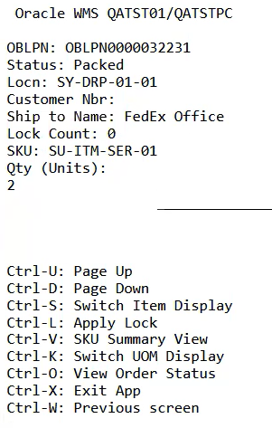 Ctrl – O: View Order Status Displays the LPN’s order and order status. (only for OBLPN Inquiry)