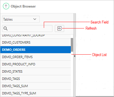 Search for and select database objects in Object Browser by selecting an object type from the Object list.