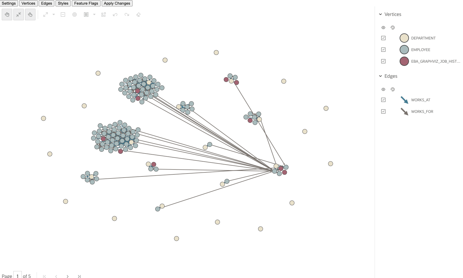 Settings: { ... layout: { type: 'force', clusterEnabled: true, clusterOptions: { clusterBy: 'DEPARTMENT_ID', hideUnclusteredVertices: true } } }The example aims to create clusters based on