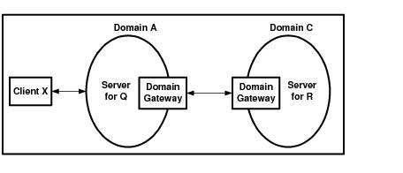 As with Client X, there must be some administration to allow Object Q1 to get at the factories and objects in Domain C. As the simple Domains configuration shows, the mechanism for communication between domains is a domain gateway. A domain gateway is a system server in a domain.