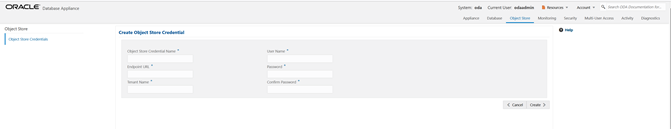 In addition to backing up to local disk, you can back up to Oracle Cloud. To back up databases in Oracle Database Appliance to Oracle Cloud, you must obtain Object Store credentials first. Once you have your credentials, click the Object Store tab, then click Create Object Store Credential.
