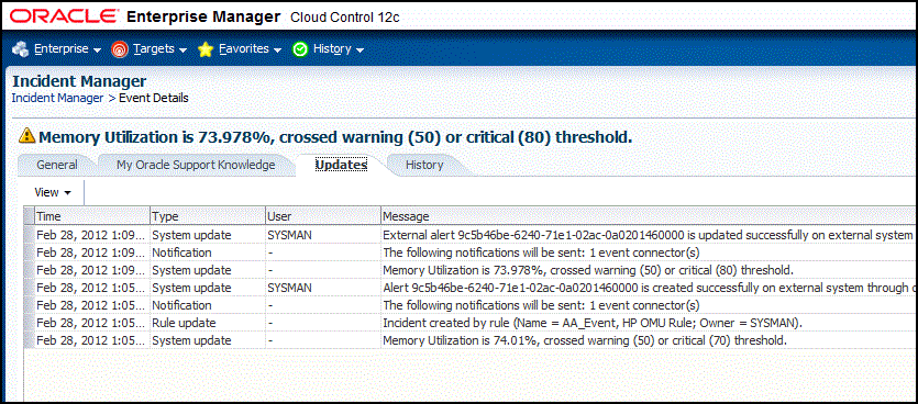 In Enterprise Manager, the event is annotated with a comment on the Updates tab to indicate that an event is created or updated, as shown in Figure 4-3.