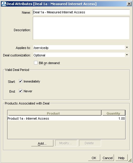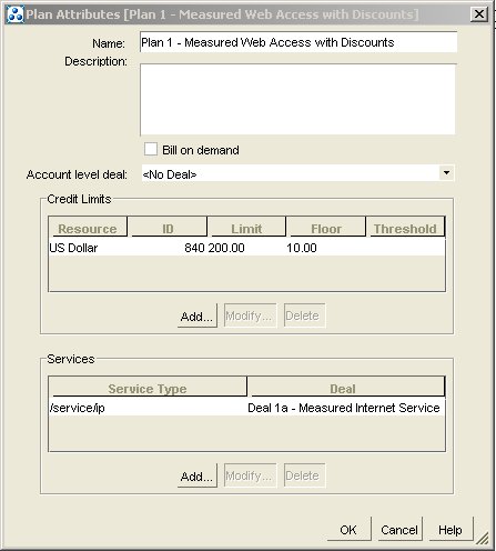 A plan consists of one or more deals. You use deals to define different ways to charge for services. For example, you can offer two different deals for Internet access: