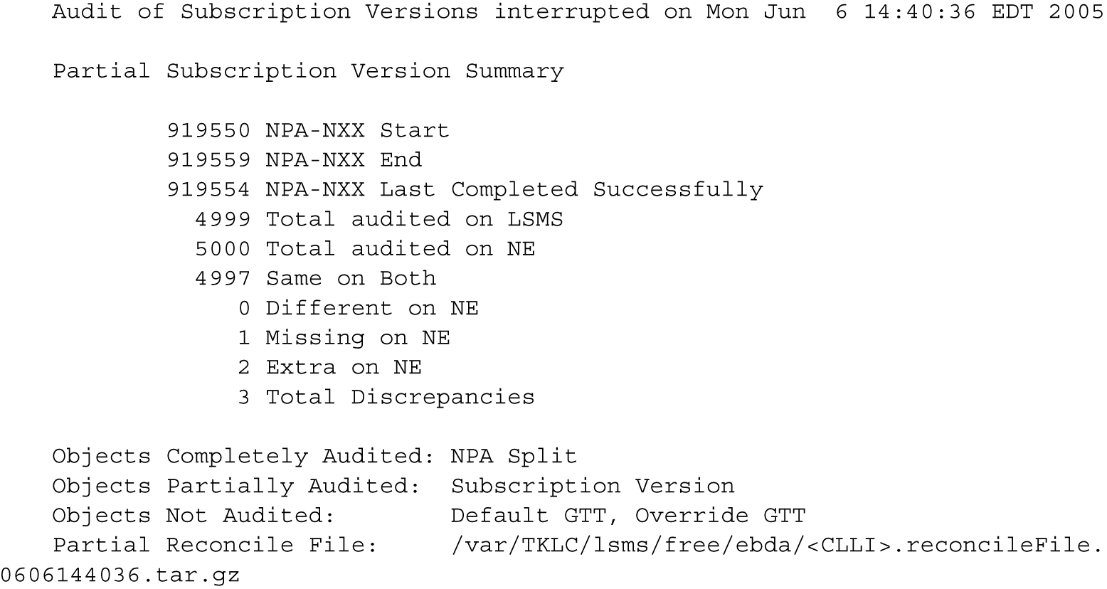 Starting with LSMS Release 8.X, whenever an audit is interrupted, the LSMS records both completely and partially audited records in the Audit Log file. The user can examine the audit log file to determine which records have not yet been audited and perform another audit of a smaller set of records. For more information, see Continuing an Interrupted Object Range Audit.