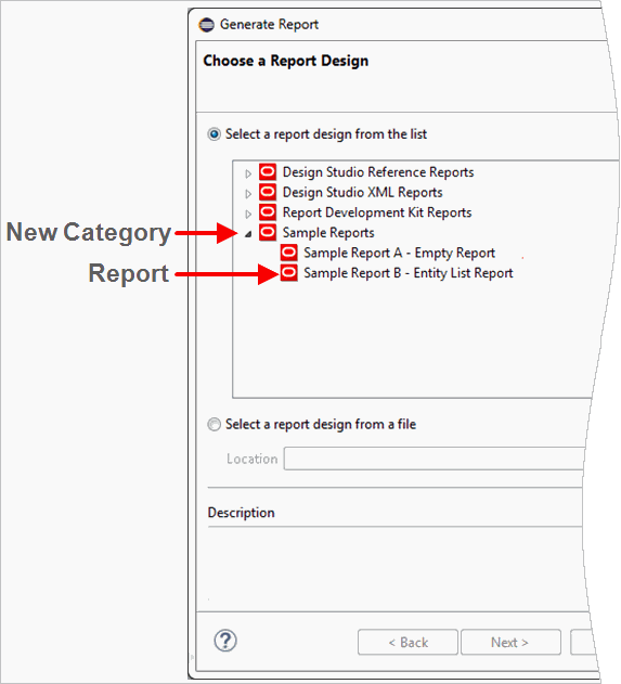 The plugin.xml project file that contains the sampleA.rptdesign and sampleB.rptdesign files, located at the root directory of the design.studio.example.report.designs project, includes an example of the configuration required to add your custom reports to the Design Studio Generate Report wizard.
