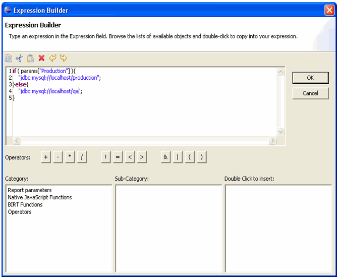 The BIRT Expression Builder is an editor that you can use to create complex expressions. These expressions can include functions, data, conditions, and operations.