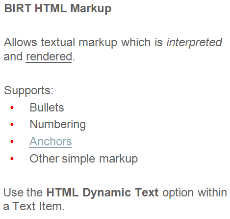 Some report design aspects may be ignored in certain output formats. Ensure that a report design is optimized for the output format. See "About Report Designs" for more information.