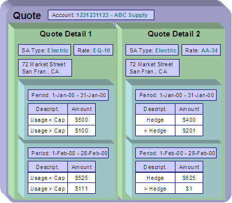 Uma cotação mostra como os segmentos de fatura de um cliente ficarão se um determinado conjunto de termos de preço for aplicado a um valor de consumo. O exemplo a seguir ilustra como uma cotação deve ficar, fornecendo a um cliente duas opções diferentes para serviço de energia. Se o cliente escolhesse uma dessas opções, um novo acordo de serviço seria criado.