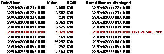 Comme indiqué précédemment, la principale action sous-tendant la modification des données en heure standard consiste à neutraliser l'effet des intervalles manquants ou en double et de sortir d'une période de changement d'heure saisonnier. L'enregistrement des données converties en heure standard garantit que tous les enregistrements d'intervalle d'une courbe donnée sont de taille égale, ce qui simplifie la logique métier qui ignore ainsi les considérations liées au changement d'heure saisonnier.