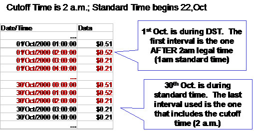 Le réglage de l'heure en fonction des changements d'horaire saisonniers constitue un problème plus courant lié aux données d'intervalle. Il n'est pas possible d'enregistrer les données d'intervalle en heure légale (c'est-à-dire en heure d'été pendant la saison de l'été), car la conversion de l'heure d'été en heure standard génère une heure dupliquée. Par exemple, aux Etats-Unis, l'heure 02:00 est répétée lorsque l'heure d'été repasse à l'heure standard.