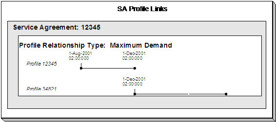 Un enlace Acuerdo de Servicio/Perfil tiene fecha efectiva. Por lo tanto, los datos que desempeñan un rol determinado pueden cambiar con el tiempo. Para ser más explícitos, un acuerdo de servicio puede tener los datos para un Perfil A que funcionen como valores de intervalo de Demanda Máxima al inicio del contrato, y luego de algunos meses, quizás se pueden usar los datos del Perfil B en su lugar. Este escenario asume que el contrato mismo no necesitaba cambiar.