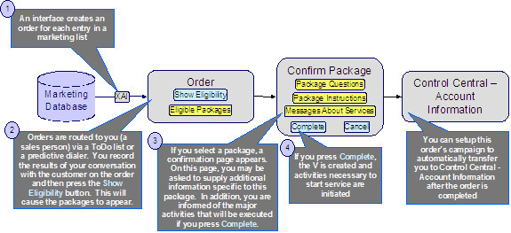 - Después de ingresar toda la información específica del paquete, se finaliza el pedido. Cuando el pedido finaliza, se configura la "V" y se inicia todo el trabajo necesario para satisfacer el pedido (por ejemplo, se crean actividades de campo, se inician procesos de flujo de trabajo, etc.).