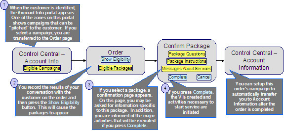 Una forma fácil de crear cargos ocasionales. El proceso de negocios anterior ilustra cómo la selección de un paquete creará uno o más nuevos acuerdos de servicio para un cliente. Si la organización impone cargos ocasionales (por ejemplo, cargos de supresión de árbol, evaluaciones de daño, etc.), el usuario también puede usar la transacción de pedido para crear un acuerdo de servicio de "cargo ocasional" y crear el cargo facturable relacionado cuando se finaliza el pedido. Para hacer esto, configure una campaña con un paquete separado para cada posible cargo ocasional. Si se crea un pedido para este tipo de campaña y se selecciona el paquete importante, el sistema configurará el nuevo acuerdo de servicio de cargo facturable y enlazará el cargo facturable a ésta. Consulte Una Manera Más Fácil de Crear Cargos Ocasionales para obtener un ejemplo de dicha campaña.