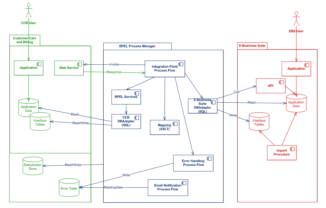 • Most of the integration processes interact with edge applications using data base adapters except for CCBCancellationWebService process where it invokes the Oracle Utilities Customer Care and Billing webservice. These integration processes extract data from source application data base tables and convert the data extracted from source data base table into an xml format.