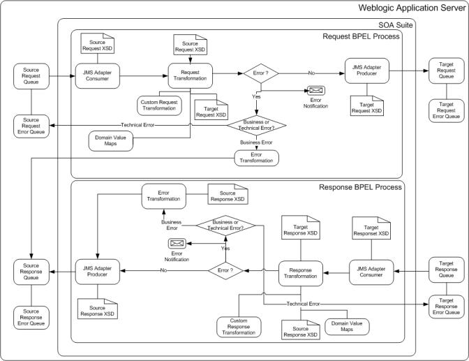 • Two BPEL processes manage each integration process: one for the request processing and one for the response processing.