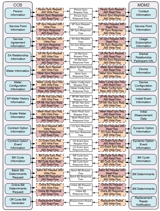 Most of the end-to-end integration processes are asynchronous. These integration processes receive messages from JMS queues and send messages to JMS queues. Oracle Utilities Customer Care and Billing and Oracle Utilities Meter Data Management have the ability to read messages from JMS queues, and then write the processed messages to JMS queues.