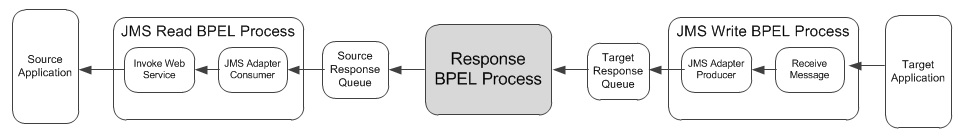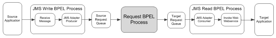 • The JMS consumer and BPEL process is configured to participate in a global transaction, so that BPEL process can issue rollback and commits on the queue. The BPEL process issues rollbacks on the queue in the scenario where it is not able to reach the target queue and the message is moved to the corresponding error queue.