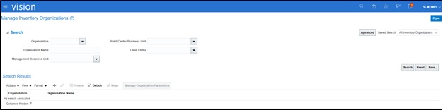 2. Navigate to Setup and Maintenance > Search > Manage Inventory Organization Locations.