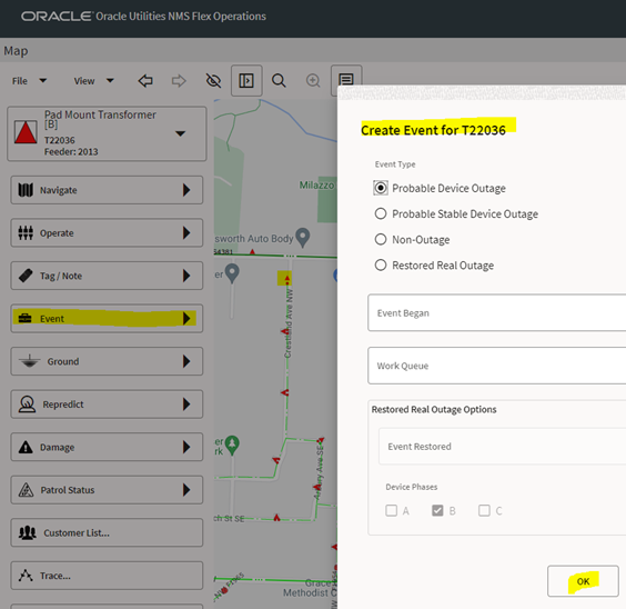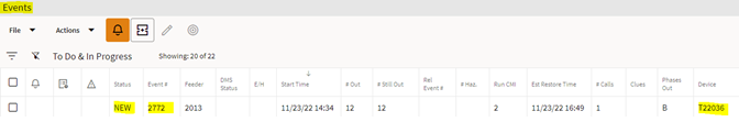 The new event will be displayed, along with the details found from Oracle Utilities Network Management System.