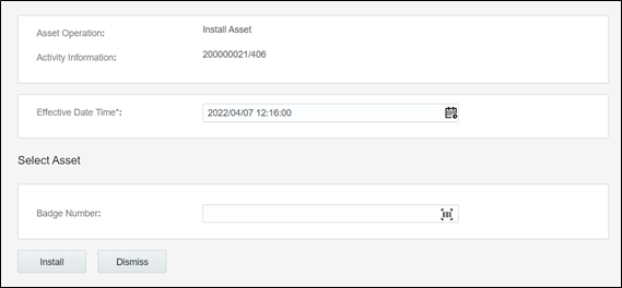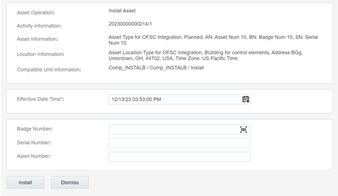 4. Enter the Badge Number of the asset to be installed in this location and click Install.