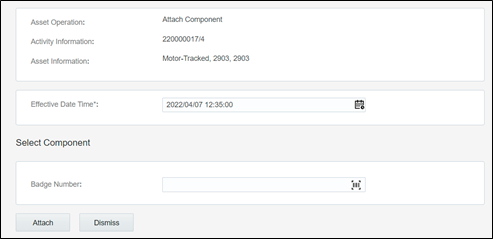 4. Enter the Badge Number of the component to be attached and click Attach.