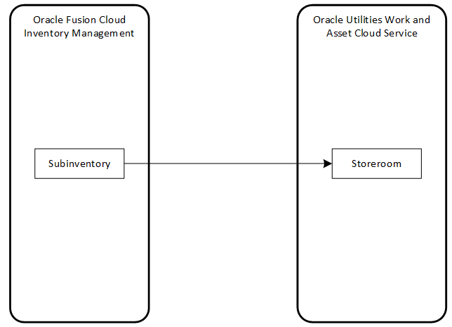 The storeroom integration transfers the sub inventory in Oracle Fusion ERP Cloud as storeroom in Oracle Utilities Work and Asset Cloud Service: