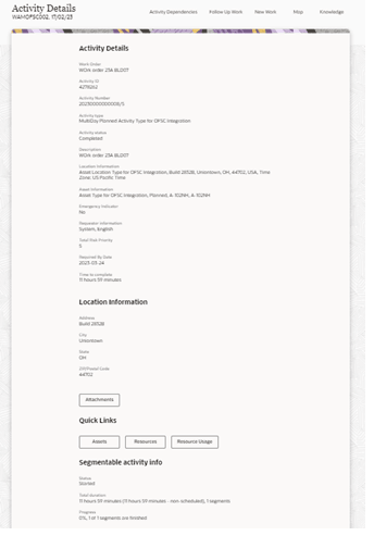 The crew can also view the details of attachments. In Oracle Field Service, click Attachment on the Activity Details page. These activity level attachments are added to Oracle Utilities Work and Asset Cloud Service while creating the activity and are sent to the Oracle Field Service through Oracle Utilities Work and Asset Cloud Service outbound messages. The user is permitted to only download the attachment but not edit or delete it at the activity level.