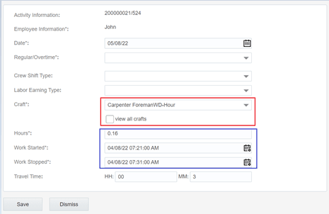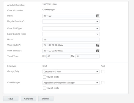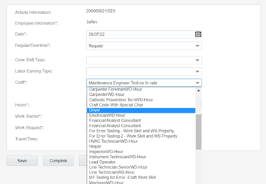 • When the activity is in started state, the Work Started field defaults to the time the crew started the activity. Work Stopped defaults with the time derived from the activity's start time plus its duration.