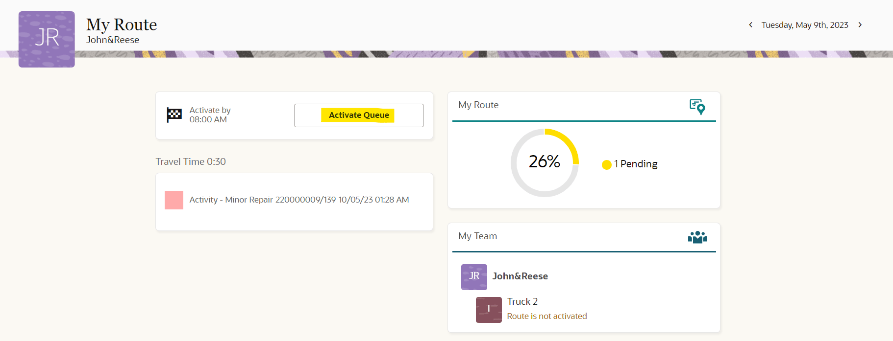 On route activation of a crew or an individual, if there are any trucks associated with that crew or an individual the initial storeroom inventory is synchronized.