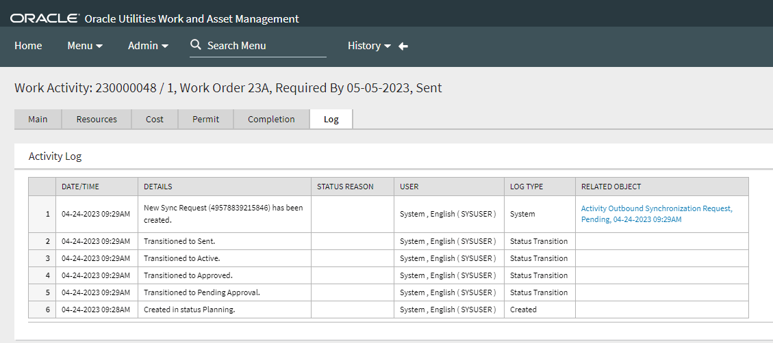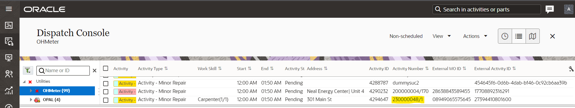 4. Navigate to the Administrator Dispatch Console in Oracle Field Service to see the mobile activity created corresponding to the activity created in Oracle Utilities Work and Asset Cloud Service.