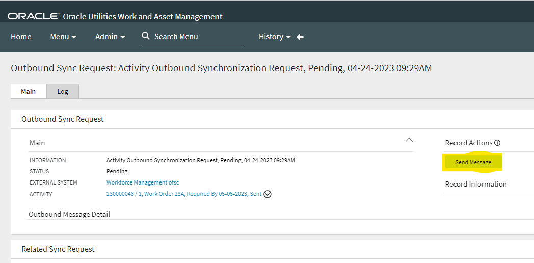3. Under Record Actions, click Send Message to initiate the request to Oracle Field Service.