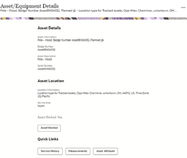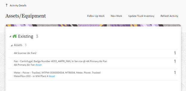 The following figure shows Oracle Field Service displaying all assets attached to an activity. Select the required asset to view the asset information.