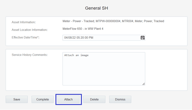 d. After the attachment is uploaded, a list of attachments (unsaved attachments) is shown. Click Complete to complete the service history.