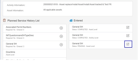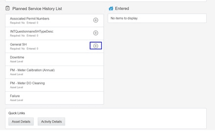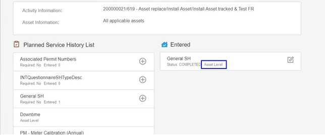 If All Applicable Assets is selected, service histories will be added at all applicable assets and will also be displayed in the Entered section with an indication as Asset Level.